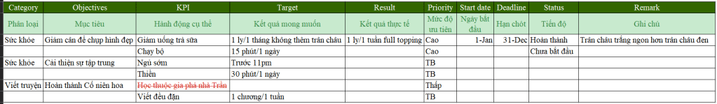 - Đối với mỗi hạng mục, bạn cần biết mình muốn đạt được điều gì, để làm gì. Việc hiểu rõ vì sao mình muốn đạt được điều này sẽ giữ bạn đi đến cùng con đường mà mình đã chọn.